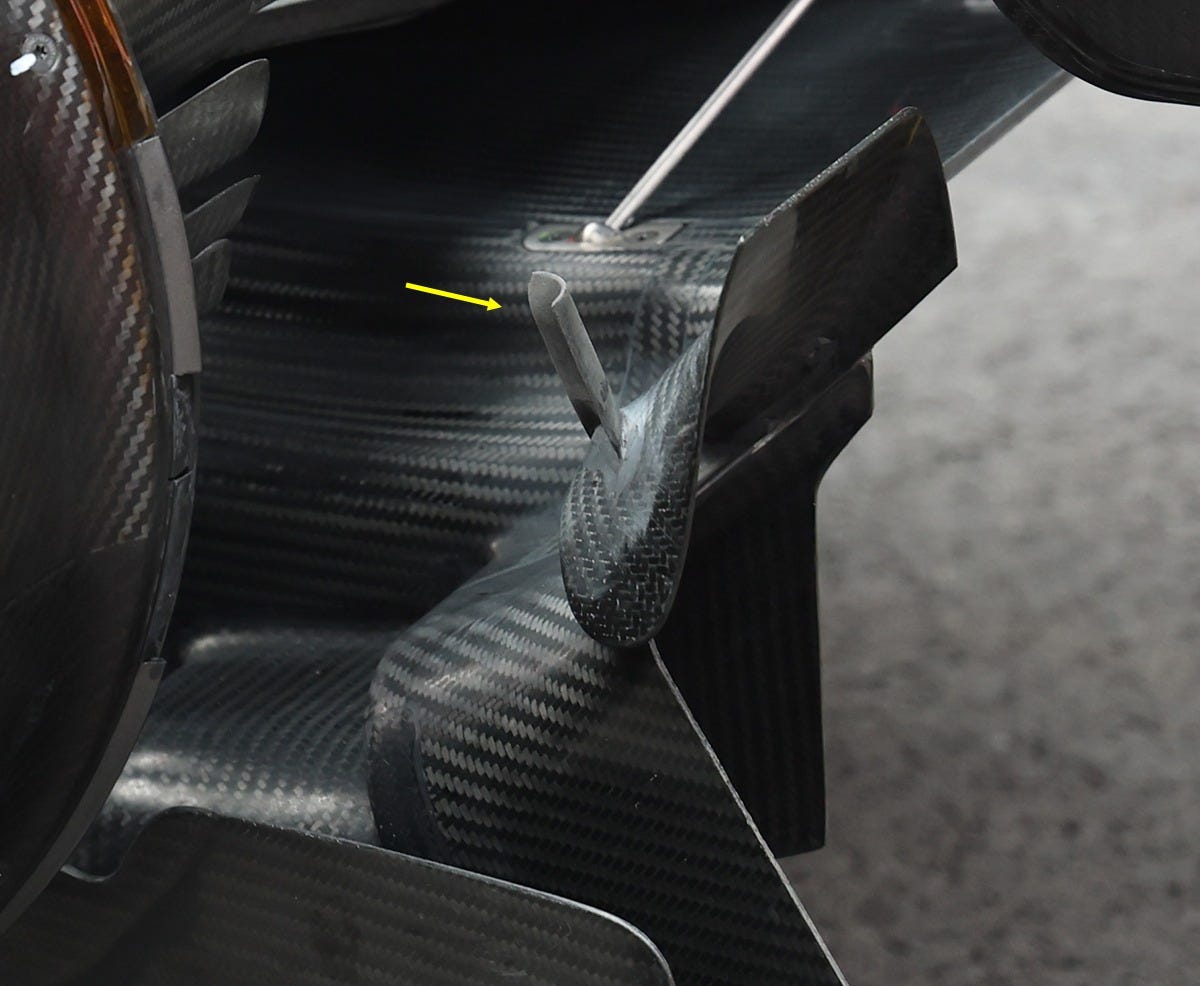 Another example of Ferrari thinking outside the regulation box is the new winglet that’s mounted on top of the upper floor winglet element (yellow arrow).